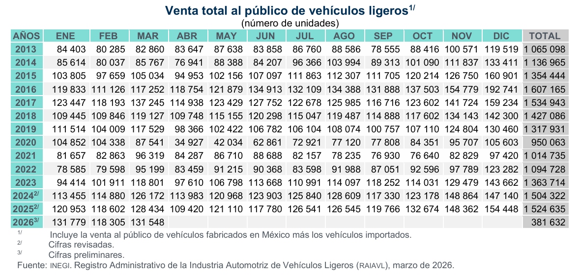 Reporte de Ventas Totales – Marzo 2026 Reporte de Ventas Totales – Marzo 2026 Reporte Completo•Noticias | AMDA Jalisco | 06 Abril 2026• Rdealba12026-04-07T00:02:49+00:00 Related Posts Reporte de ventas al público en el mercado interno, producción y exportación INEGI- marzo 2026 Reporte de Comercialización de Vehículos Híbridos y Eléctricos Reprogramación Volanta de Refrendo de Licencia Taller Gerencial de Administración al Departamento de REFACCIONES